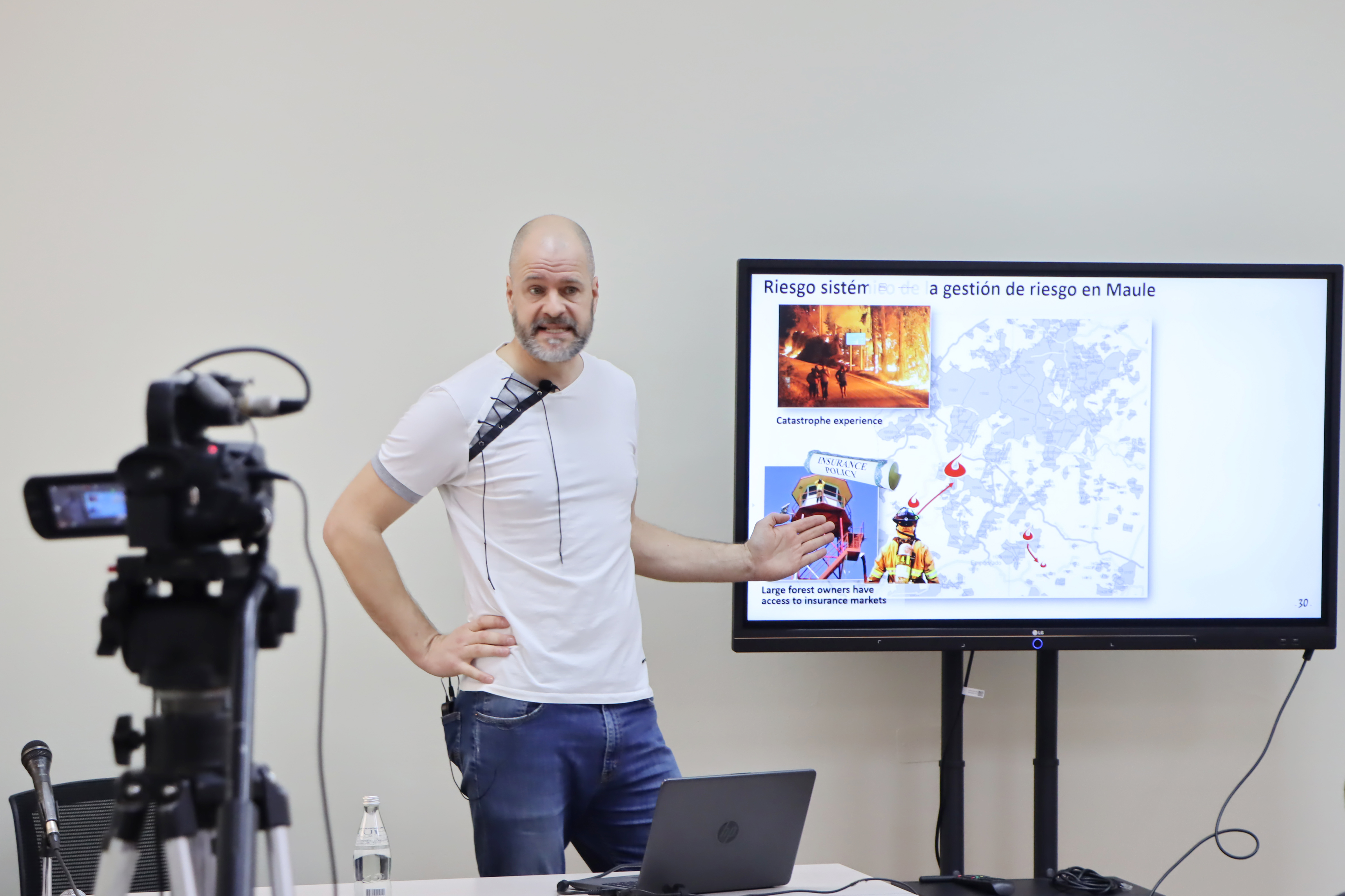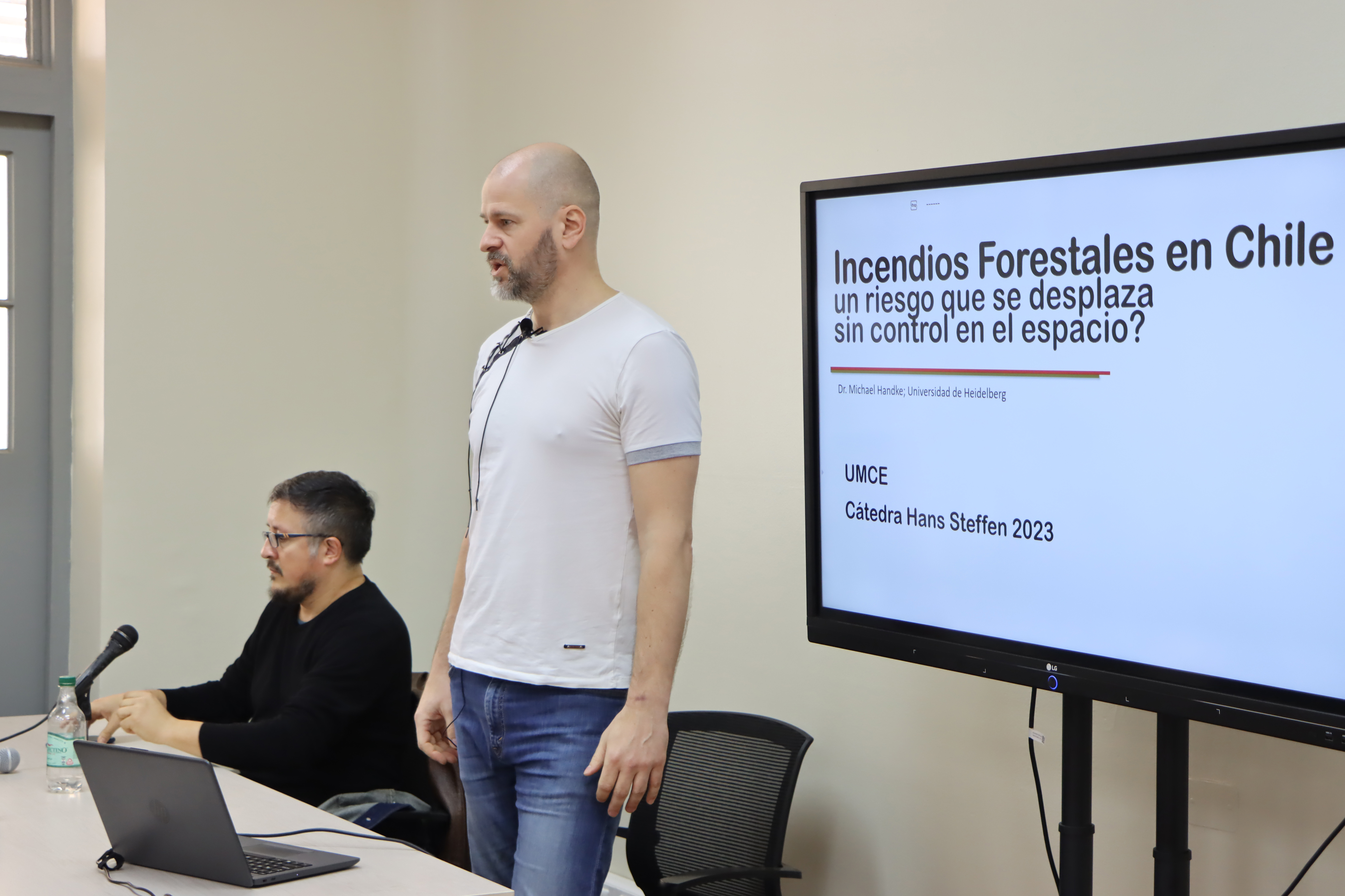 La tercera sesión estuvo a cargo del profesor Dr. Michael Handke, académico del Instituto de Geografía de la Universidad de Heidelberg, quien lleva años investigando temas relativos a la geografía económica de las plantaciones forestales, el impacto de las economías globales en regiones locales y los desafíos de la gestión integrada de los ambientes productivos: “Sus trabajos se centran en dilucidar las formas de conocimiento sobre el riesgo que genera cada uno de los actores intervinientes en un territorio particular y cómo estos pueden facilitar la resolución de problemáticas espaciales por medio de una gobernanza situada”, añadió Marcelo Garrido.