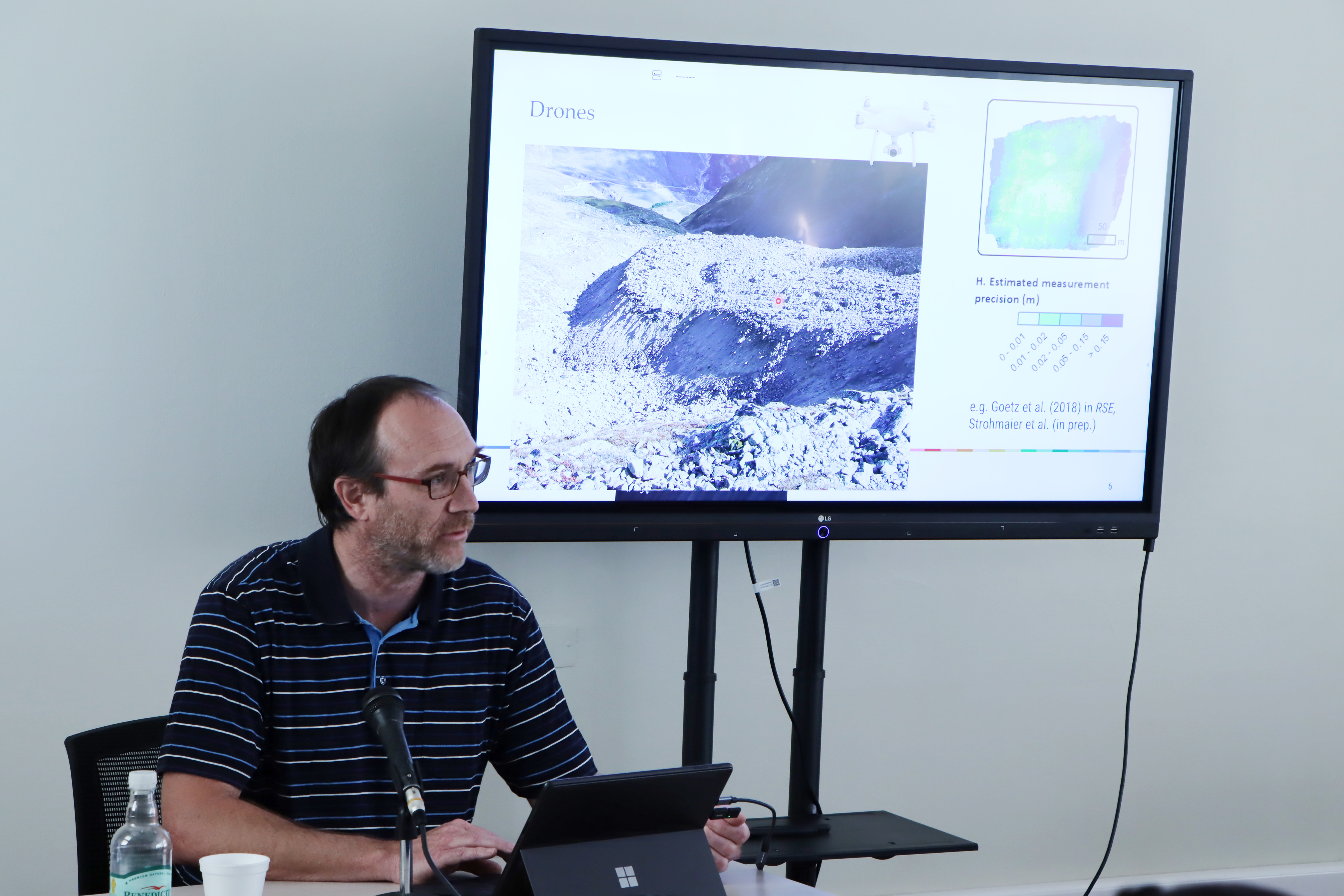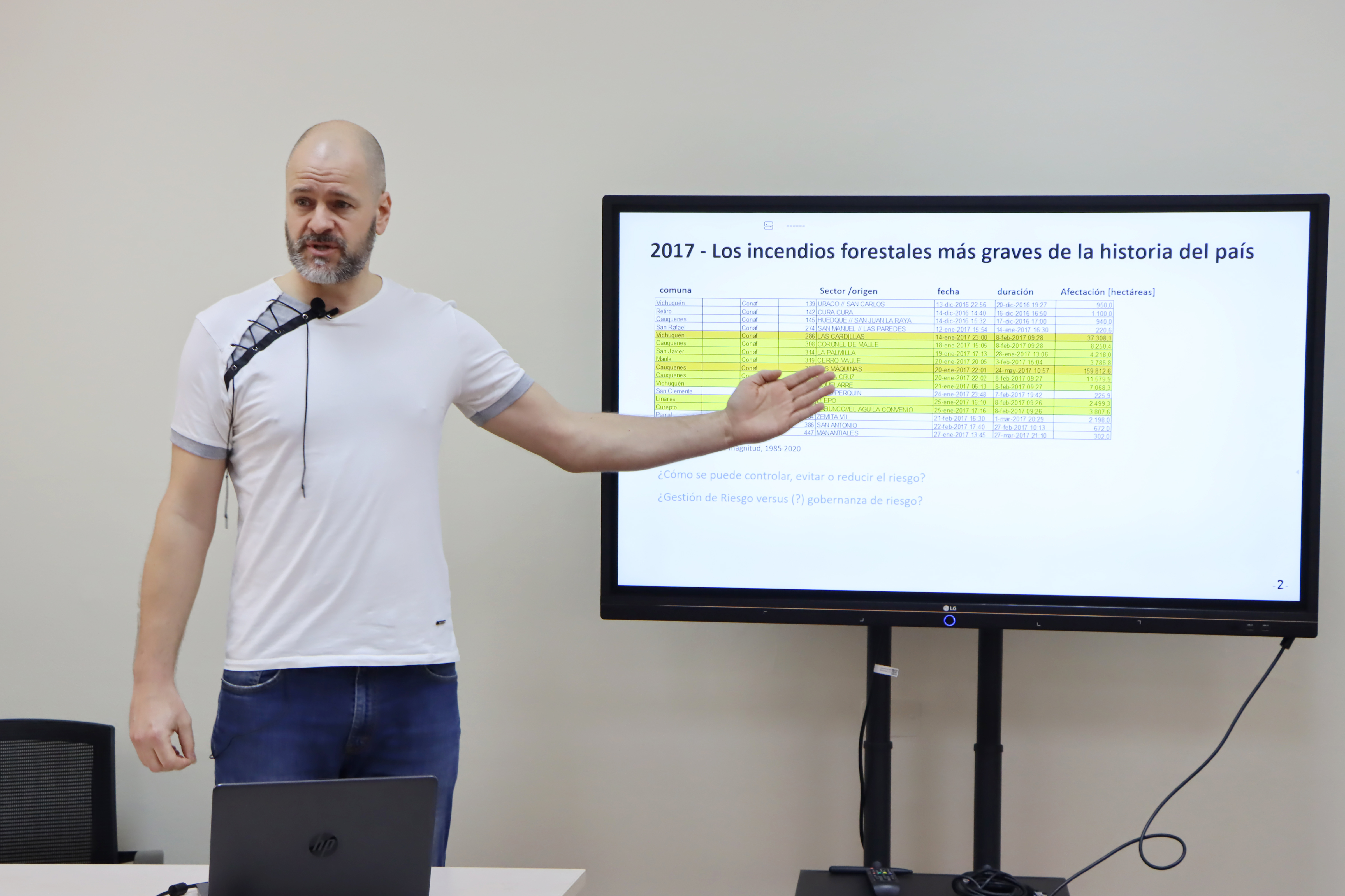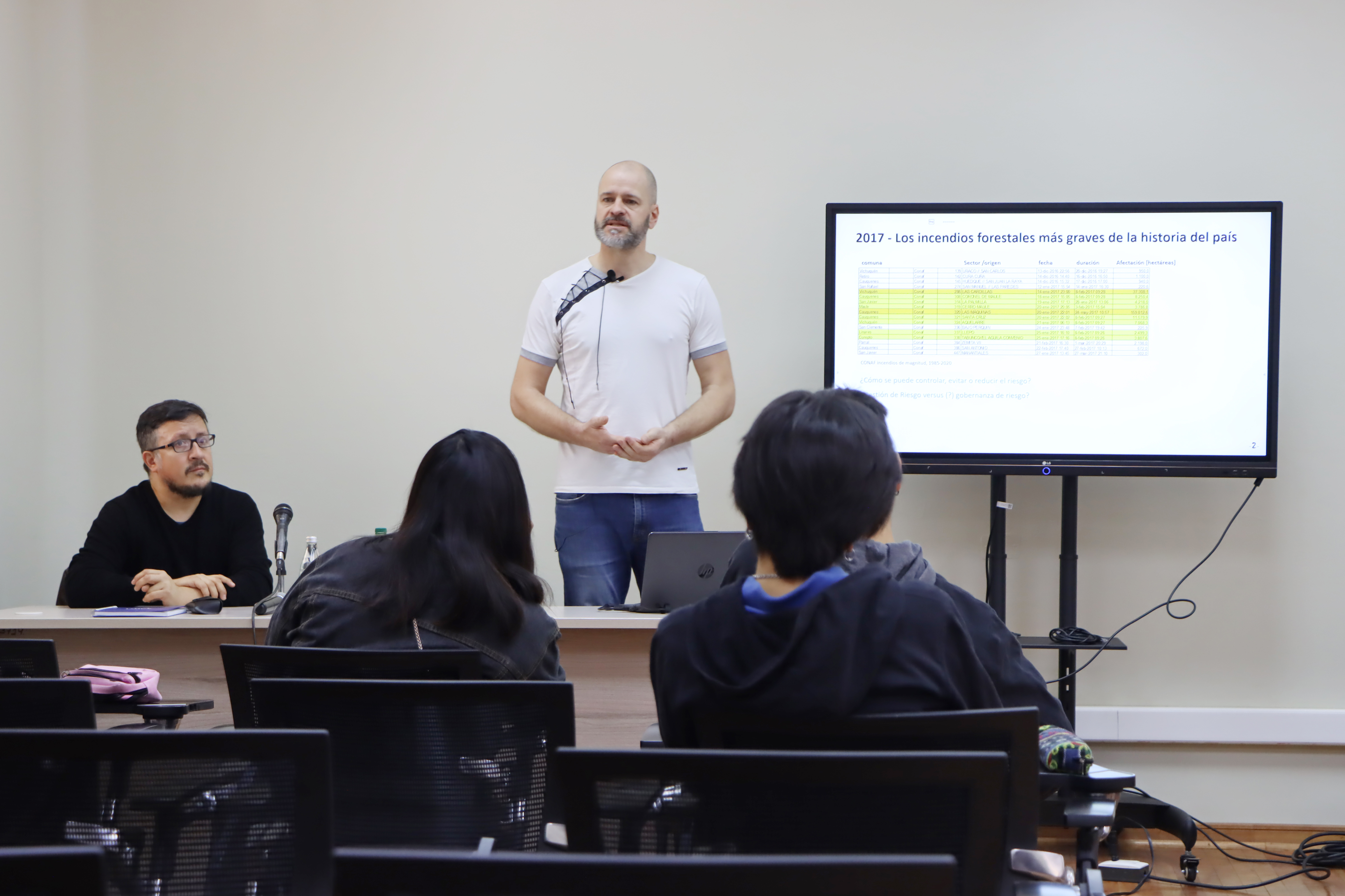 En la primera sesión, el Dr. Alexander Brenning de la Universidad de Jena (Alemania), destacado geoinformático especialista en métodos cuantitativos aplicados al análisis geomorfológico de ambientes periglaciales de montaña presentó la conferencia 'Ciencia de datos geoespaciales: oportunidades y desafíos en el estudio de los peligros naturales'. “El profesor Brenning trabajó durante su exposición los aspectos más centrales derivados del uso de la información espacial, sobre todo la relación que tiene ésta con la producción voluntaria de datos geográficos, la creación de modelos predictivos y las limitaciones que tienen algunos procesos representacionales que sistematizan la dinámica de los ambientes donde existe peligro natural. Todo lo anterior, cobra sentido cuando los organismos especializados que toman decisiones territoriales deben sustentar consistentemente sus acciones en evidencias empíricas que se presentan como dinámicas, multiescalares y de origen diverso”, explicó el profesor Garrido.